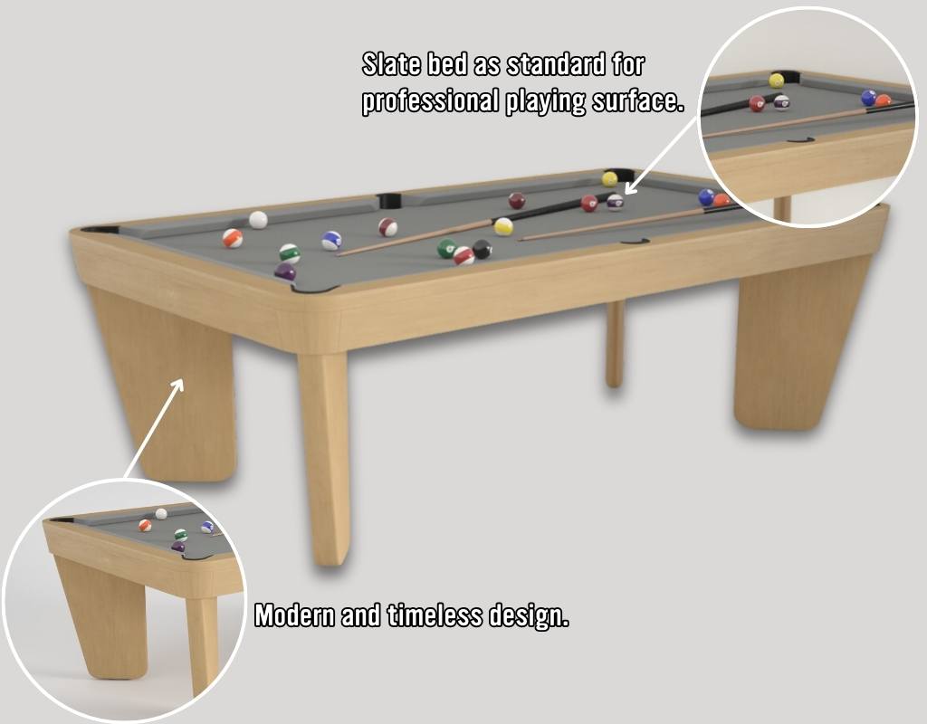 The Safran is part of the Montfort Classic Range, combining a timeless aesthetic with modern construction. It features a solid Beech or Oak frame and legs, and a concealed metal support frame for strength and durability. The slate bolts onto the internal metal frame, while the cushions and top frame bolt directly to the slate, giving an incredibly solid, secure and stable playing surface.