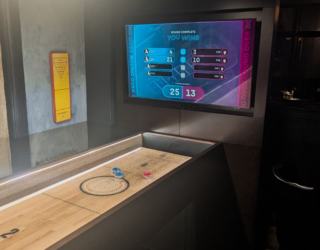 It is also supplied with the overhead lighting bar, which is required to ensure the playfield is adequately lit for the camera to read where the pucks are. This has to be installed directly over the shuffleboard, either affixed to the ceiling (this is work that you will need to arrange to happen at the same time as we install the Neo Shuffle) or you can purchase the optional Light Bar Post which then allows the light bar to be fixed to this. We recommend choosing this option as it avoids the need for the lights to be installed by you to your ceiling and makes the unit able to be moved in future should you decide you need to use your space differently.