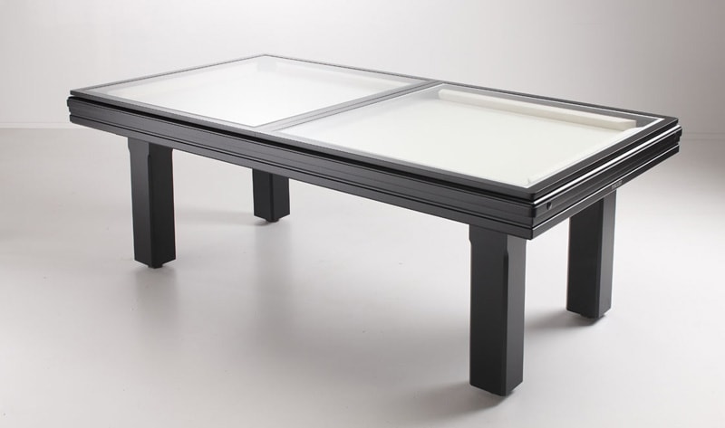 For those of you looking to get a secondary use out of your pool table as a dining area or work surface, a pool dining table is the perfect marriage of fun and convenience. The majority of our pool dining tables simply require the placing of two hard tops onto the frame; the table is ready for use immediately, and is almost indistinguishable from a regular dining table. To play pool again all you need to do is remove the tops.