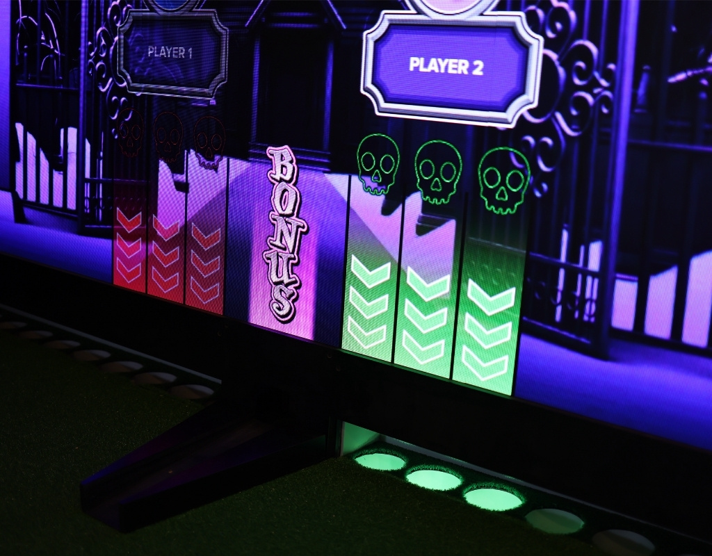 Guests take turns putting the ball into target numbers on the green. Each game has different objectives, from classic high-score challenges to fun party games. Difficulty can be set per session, and teams or individual players can be selected using a drag-and-drop touchscreen interface.