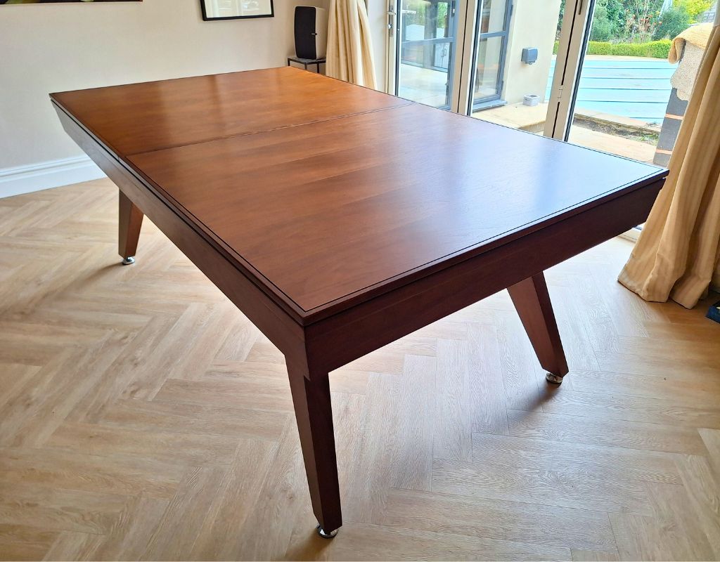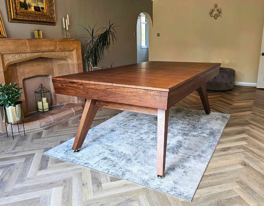 The Sexton Pool Dining Table combines luxury design with tournament-grade performance. Made from ethically sourced solid wood, it meets WEPF standards with precision cushions, pocket openings, and a ball return system. Its slate bed is levelled to 0.02mm per metre, ensuring perfect play, while professional cushions offer consistent rebounds.